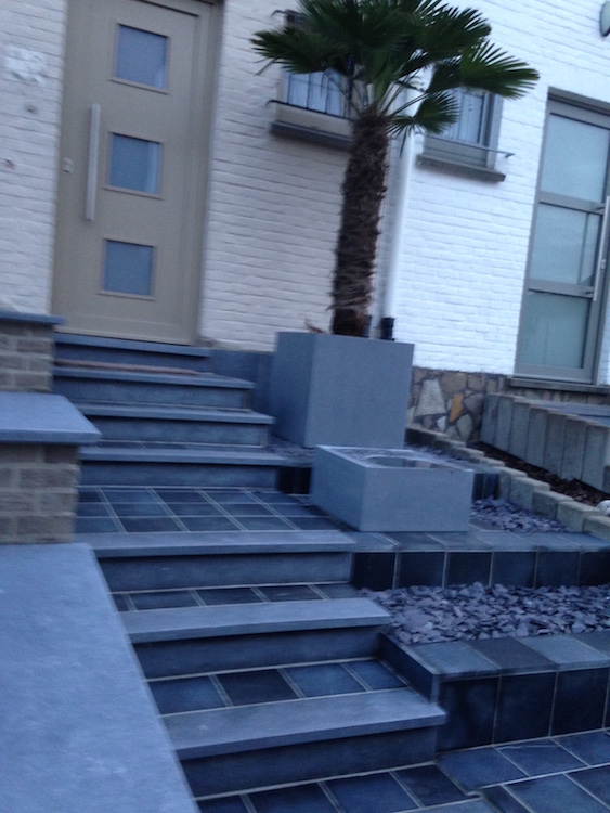 Aanleg van oprit garage en patio, metsen van zijmuurtjes.