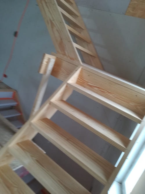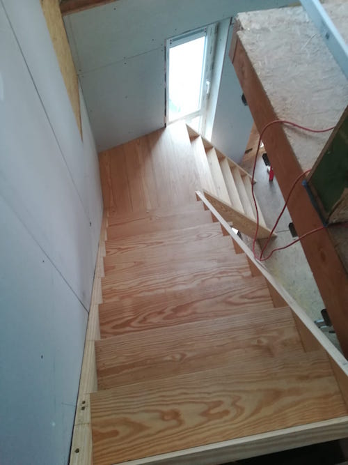 Trap op maat in Yellow Pine hout, afgewerkt met muur.